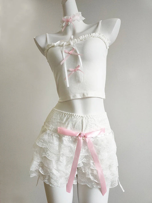 Our adorable sets are perfectly curated outfits, combining delicately made tops with matching skirts or shorts. Adorned with sweet details like bows, ribbons, and soft pointelle fabric ruffles, each set captures the essence of kawaii style.