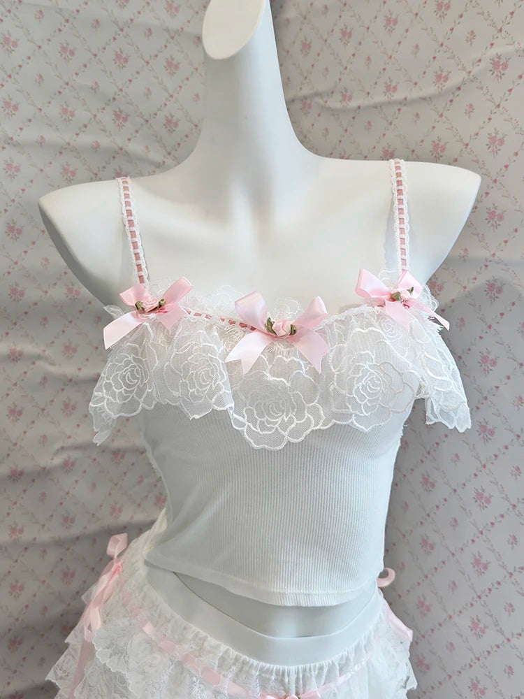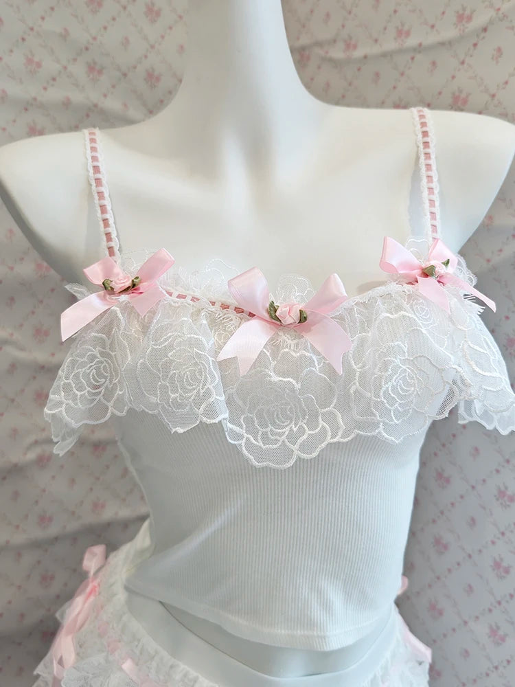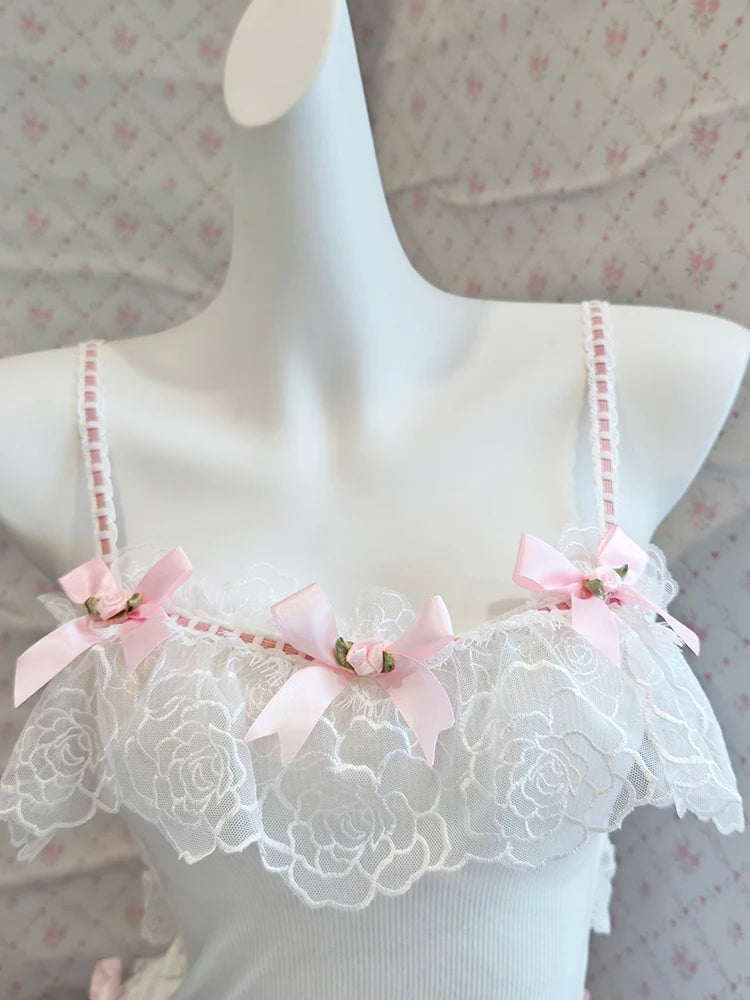 ♡ Details: Lace trim, bow decorations, textured patchwork, and dainty ruffles