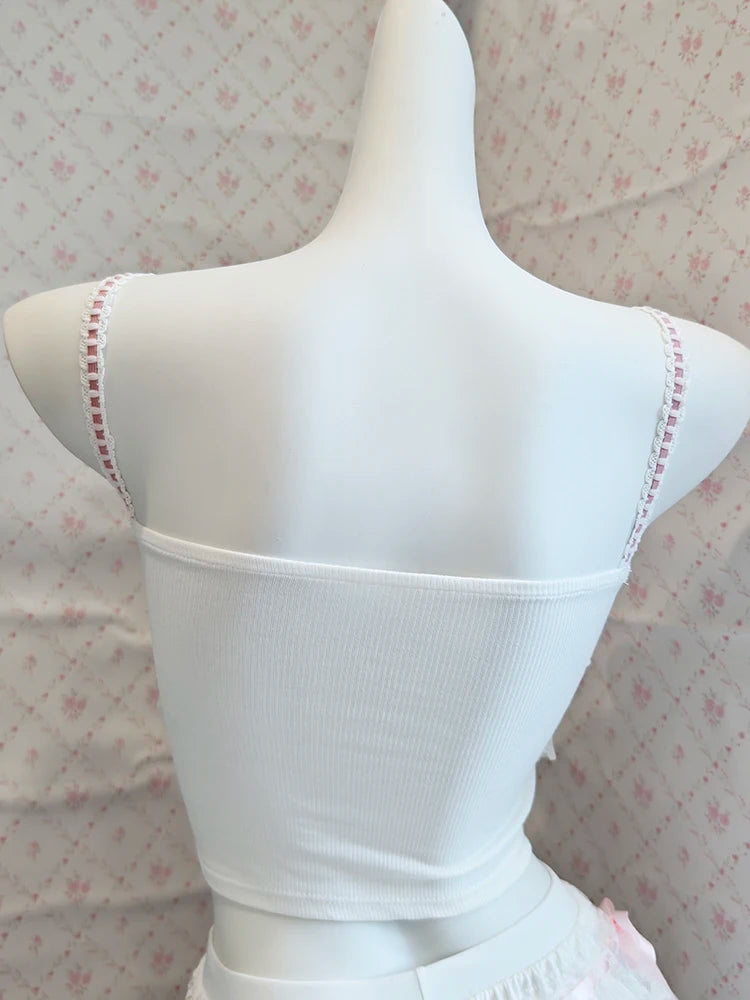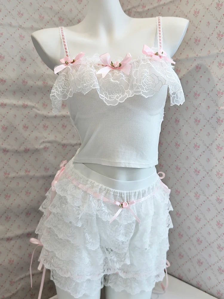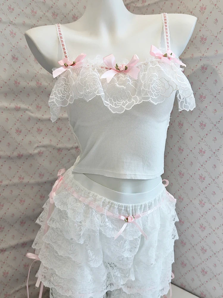 ♡ Design: Cropped cami top with mesh paneling and floral accents, optional matching shorts