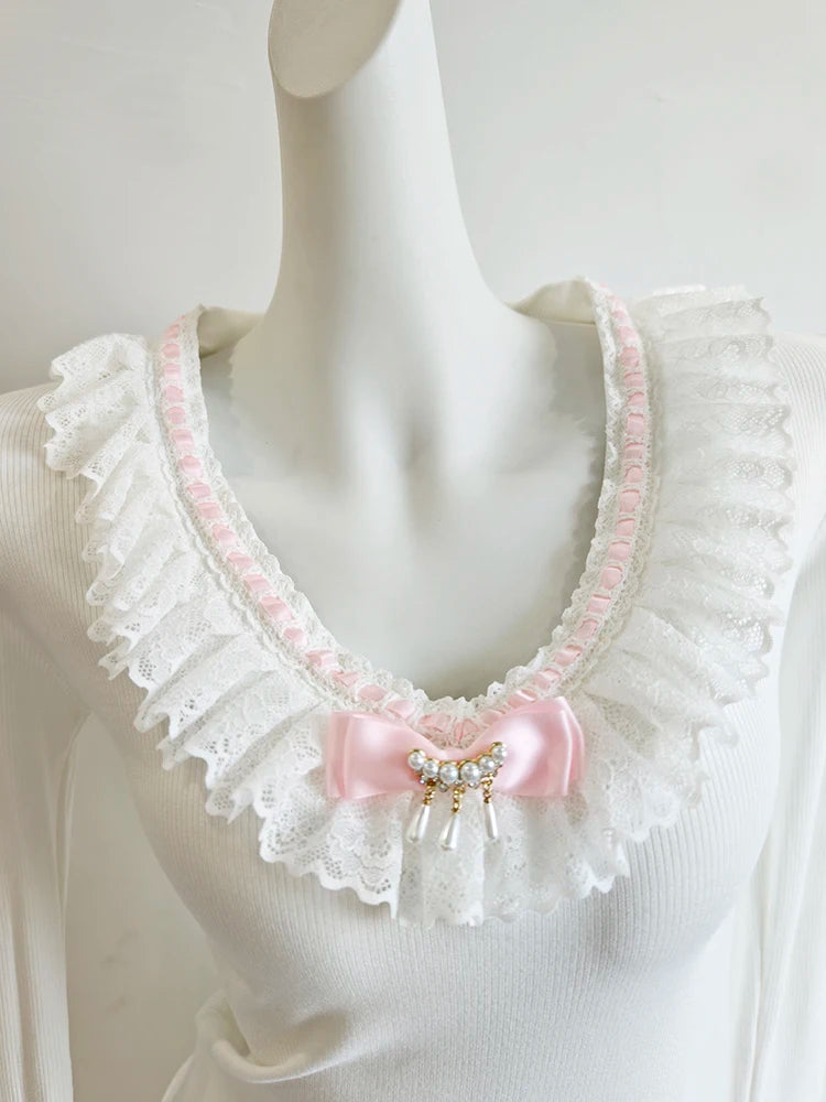 Details: Lace trim along neckline, small bow decoration, soft knit texture