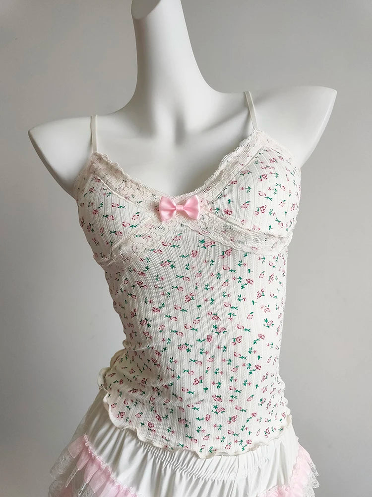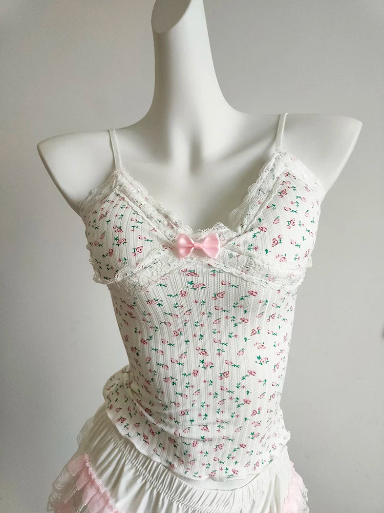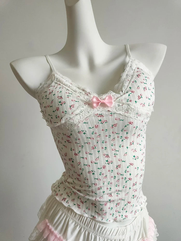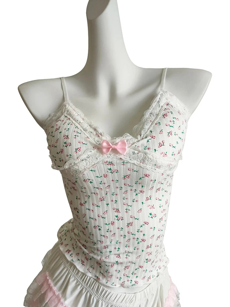 A floral cami with a soft, feminine feel—perfect for sunny days. The cropped cut is short and sweet, with a delicate bow detail and light stretch for comfort. Easy to pair with skirts, cardigans, or layered looks.