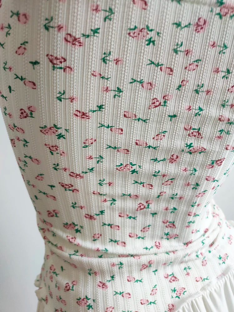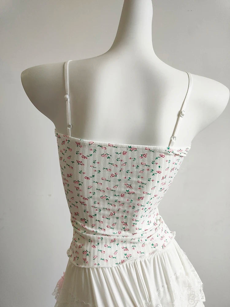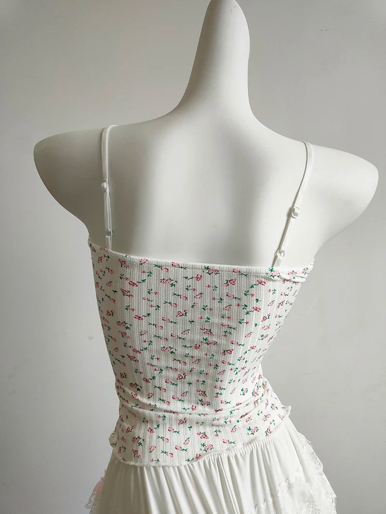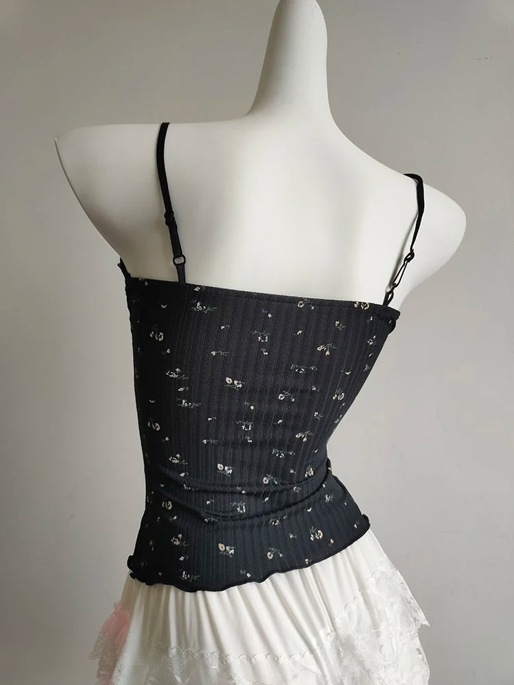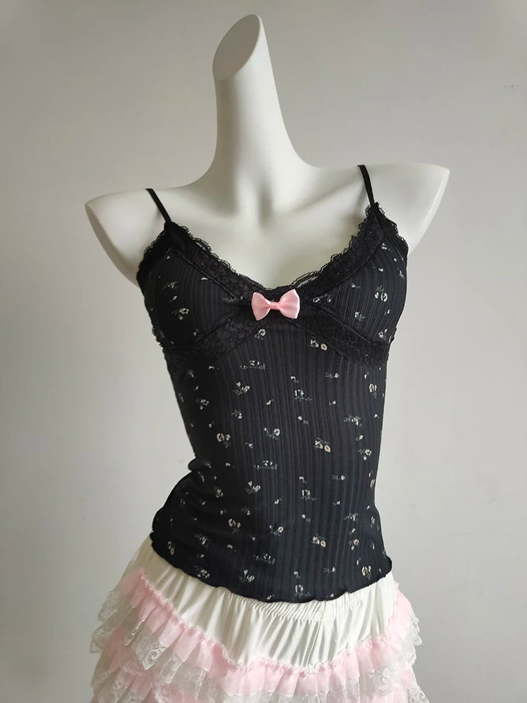 A floral cami with a soft, feminine feel—perfect for sunny days. The cropped cut is short and sweet, with a delicate bow detail and light stretch for comfort. Easy to pair with skirts, cardigans, or layered looks.