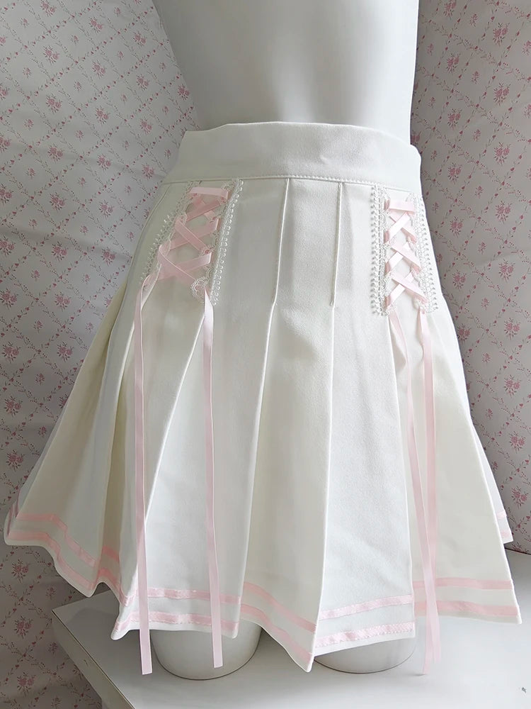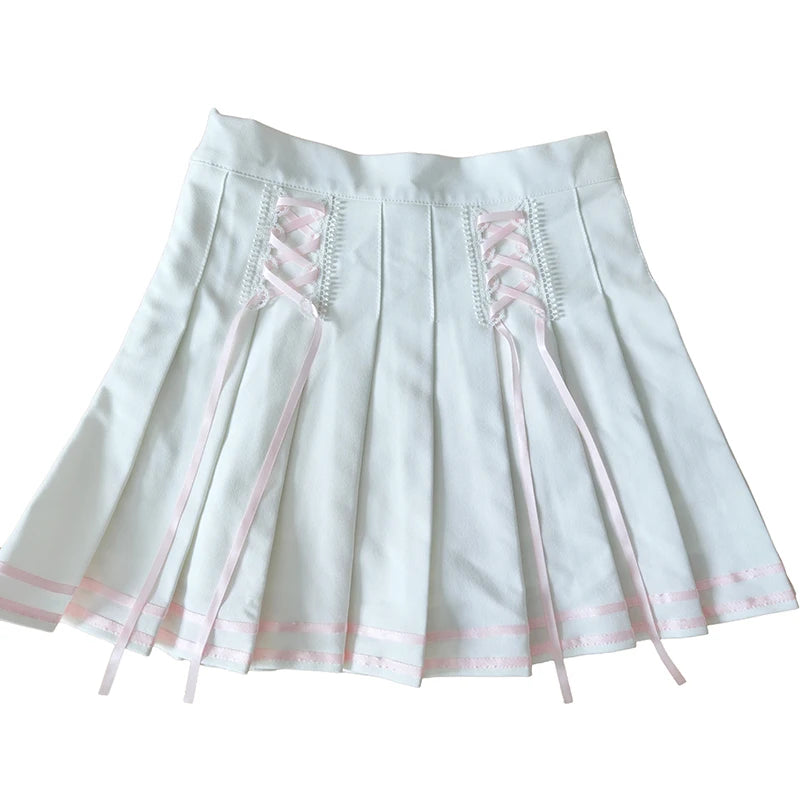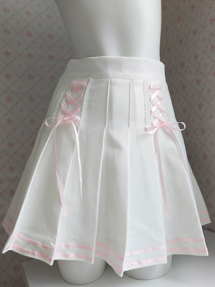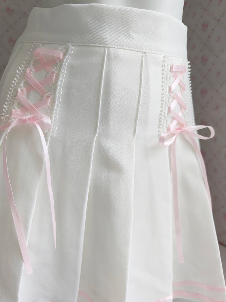♡ Design: Mini white pleated skirt with pink lace-up detail and hidden shorts