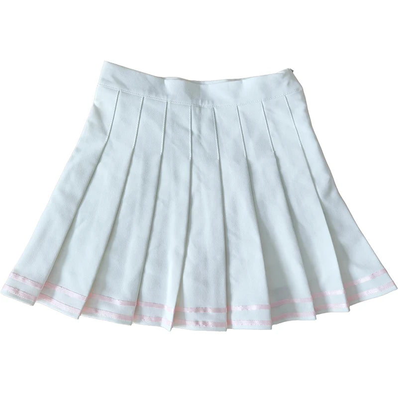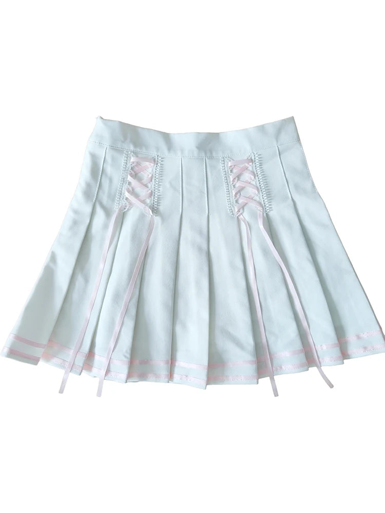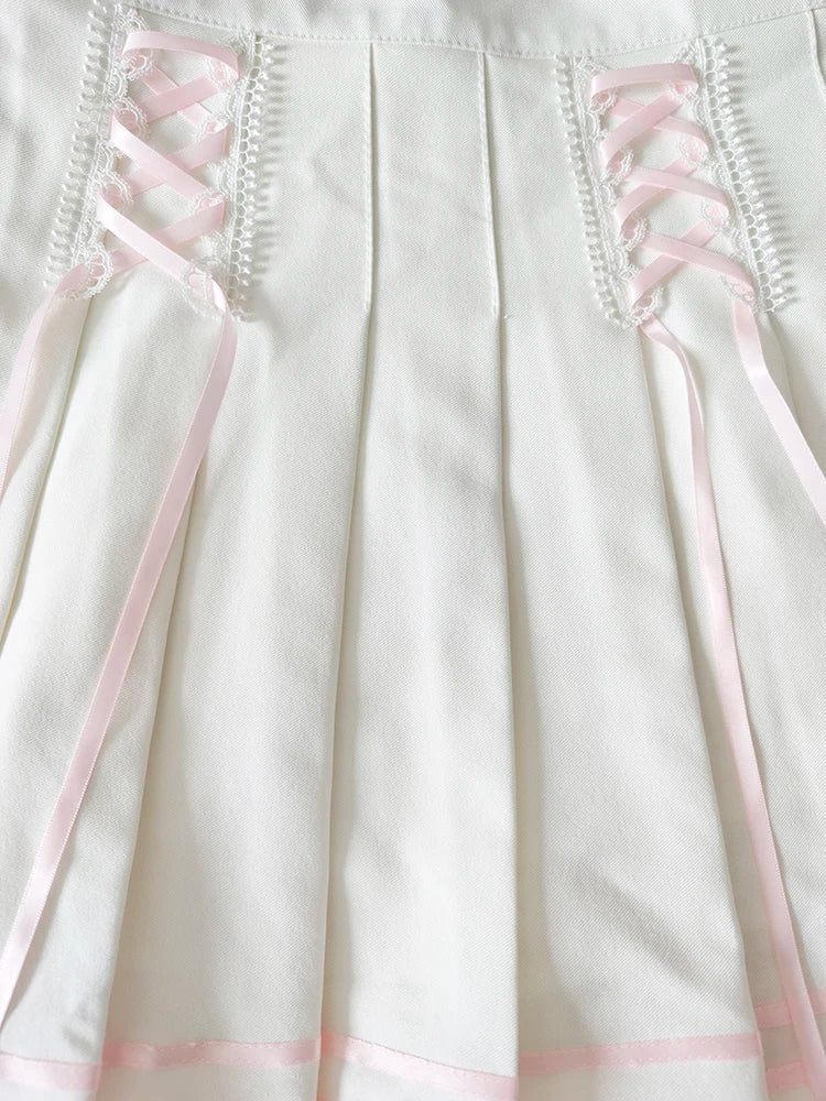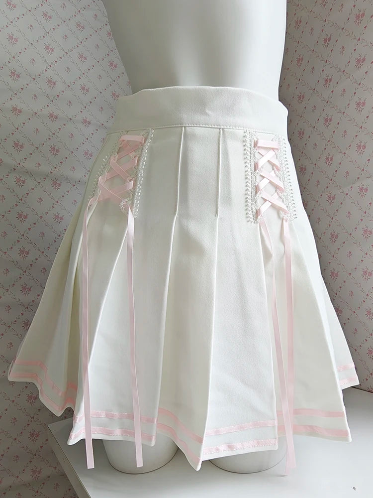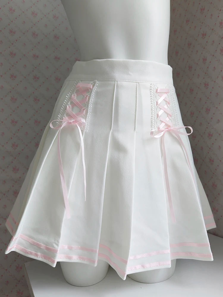 ♡ Design: Mini white pleated skirt with pink lace-up detail and hidden shorts