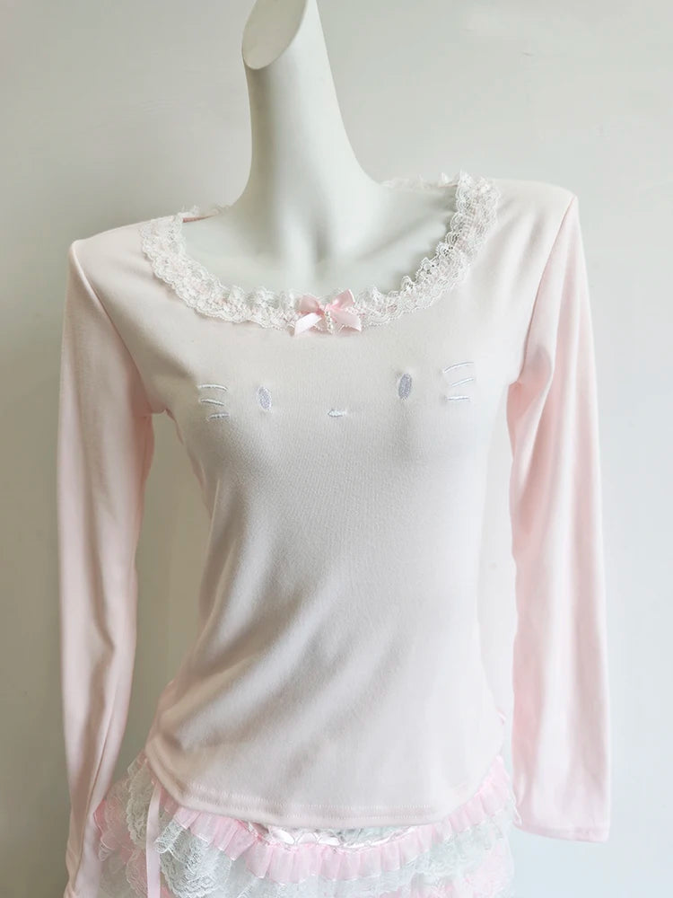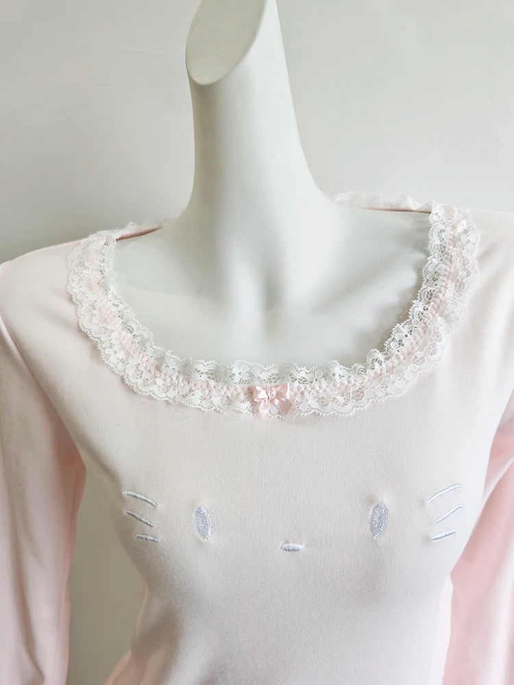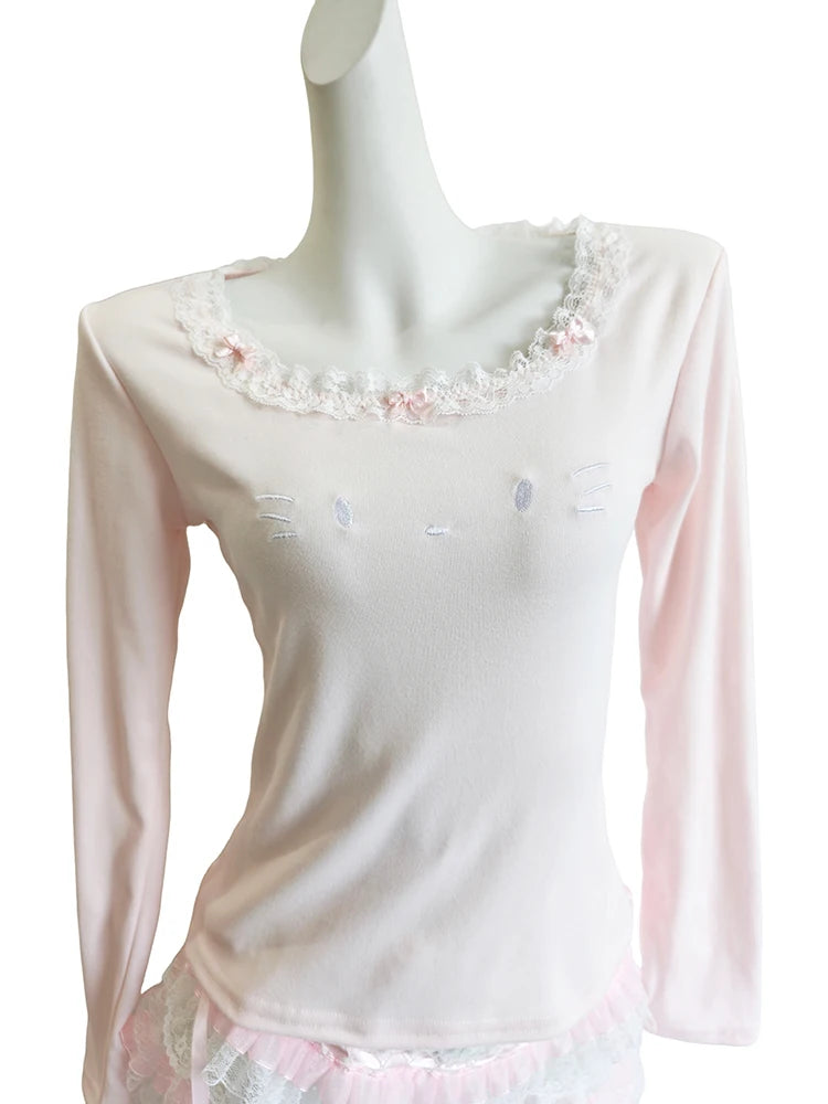 A cozy pink long-sleeve tee lined with soft fleece, perfect for cooler days while still keeping a sweet, kawaii look. Finished with lace trim and a tiny bow detail, it’s comfy, cute, and easy to style with skirts or cozy layers.