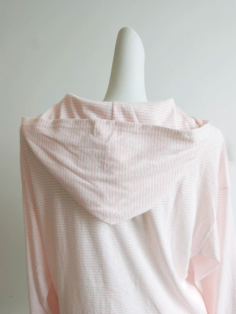 Design: Loose zip-up hoodie with soft pink stripes
