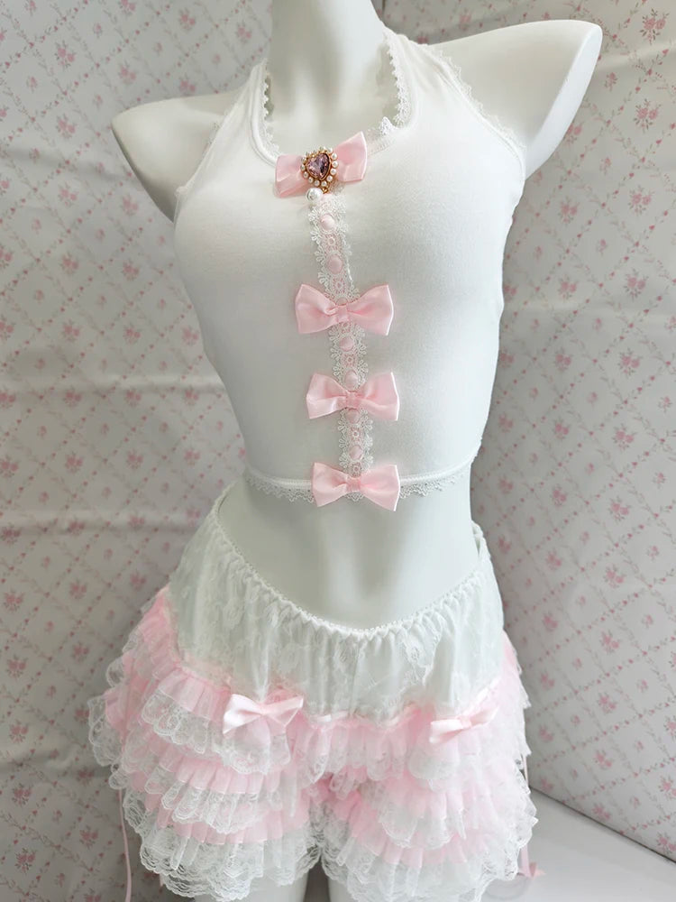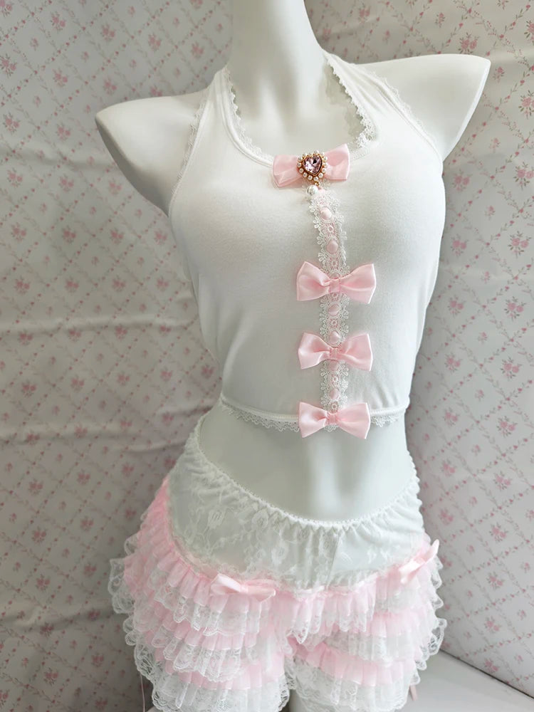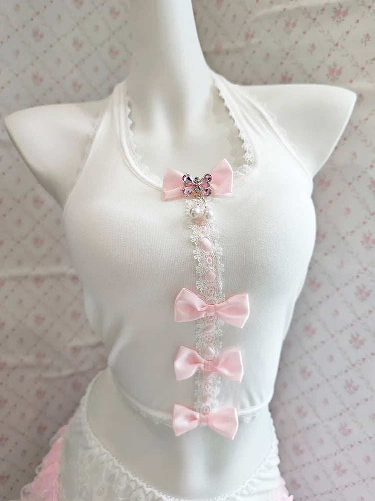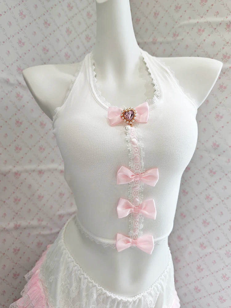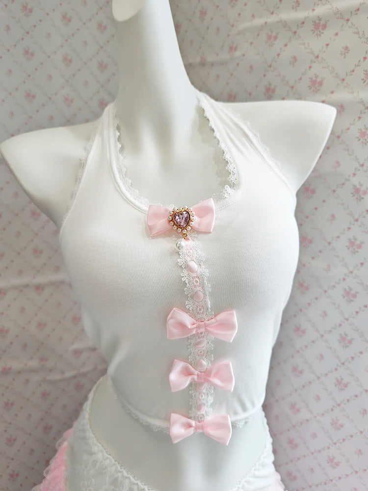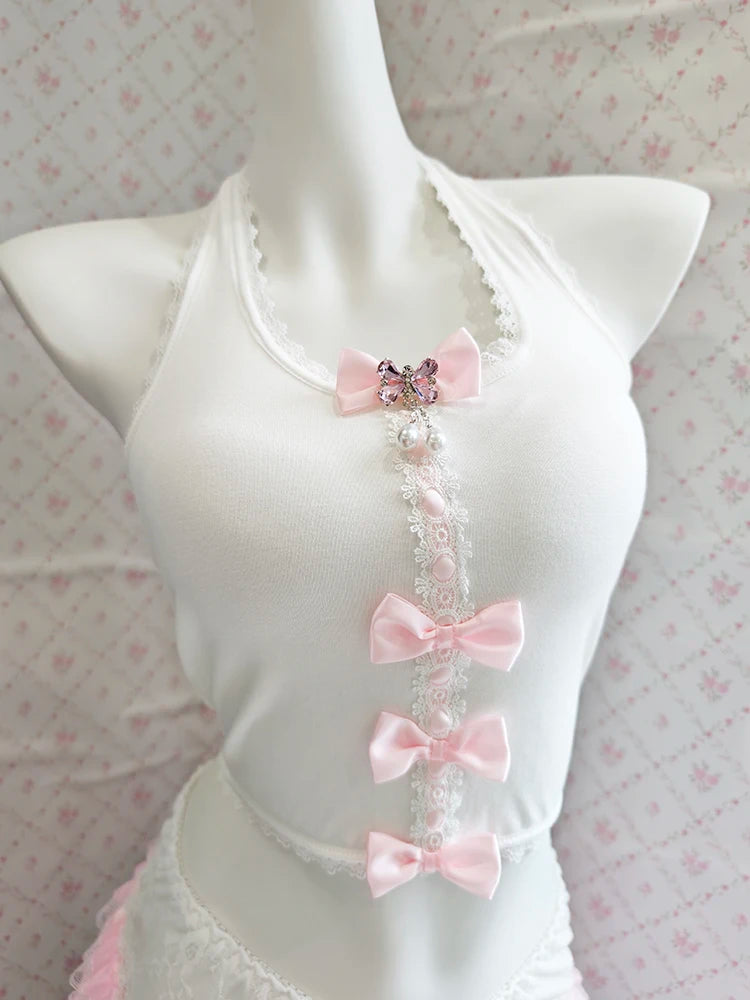 ♡ Details: Bow accents, soft fabric texture, dainty back ties