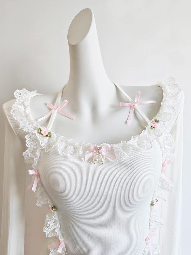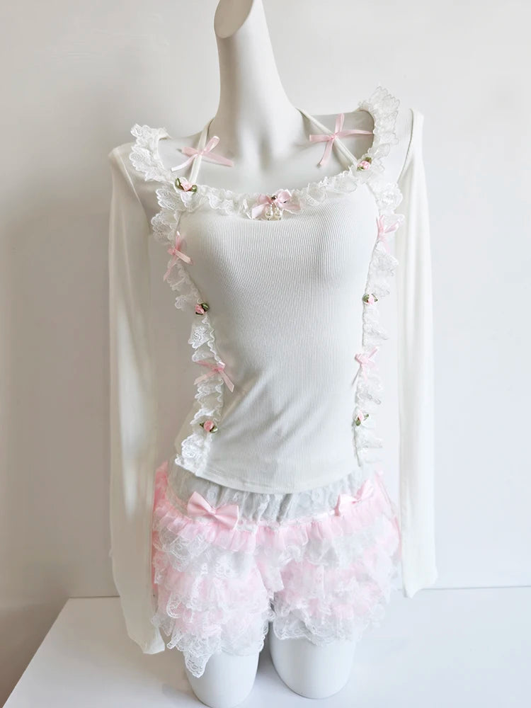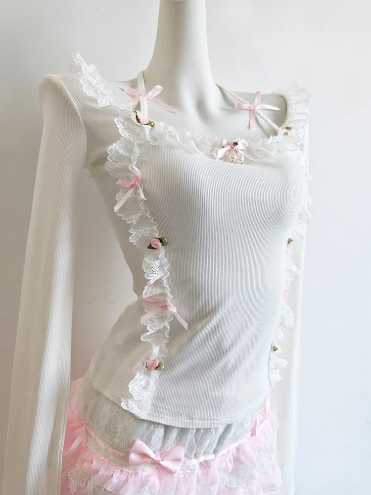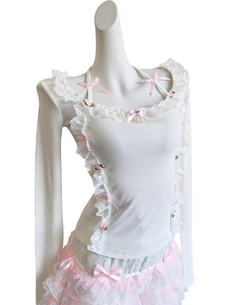 A sweet long-sleeve tee with a halter-style neckline and delicate lace trim for a soft, romantic look. Finished with tiny bows and floral details, it hugs comfortably thanks to its stretchy fabric and feels perfect for warm, dreamy days.