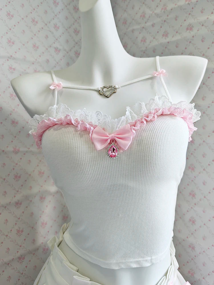A sweet cropped cami trimmed with lace and decorated with soft pink bows and a tiny pendant detail. This delicate piece is perfect for pairing with high-waisted skirts or layering into your favorite soft-girl looks.