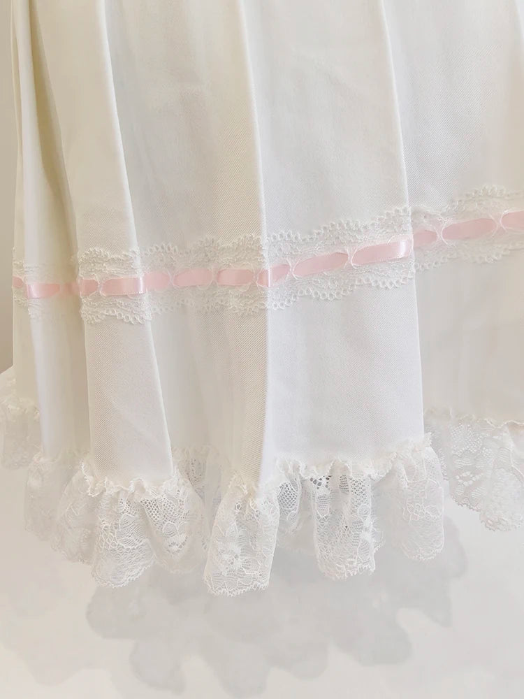 A sweet pleated mini skirt made for doll-like days. Finished with lace trim and tiny pink bows, this high-waisted A-line style brings a soft Harajuku touch to any outfit. Hidden shorts underneath make it perfect for everyday wear.