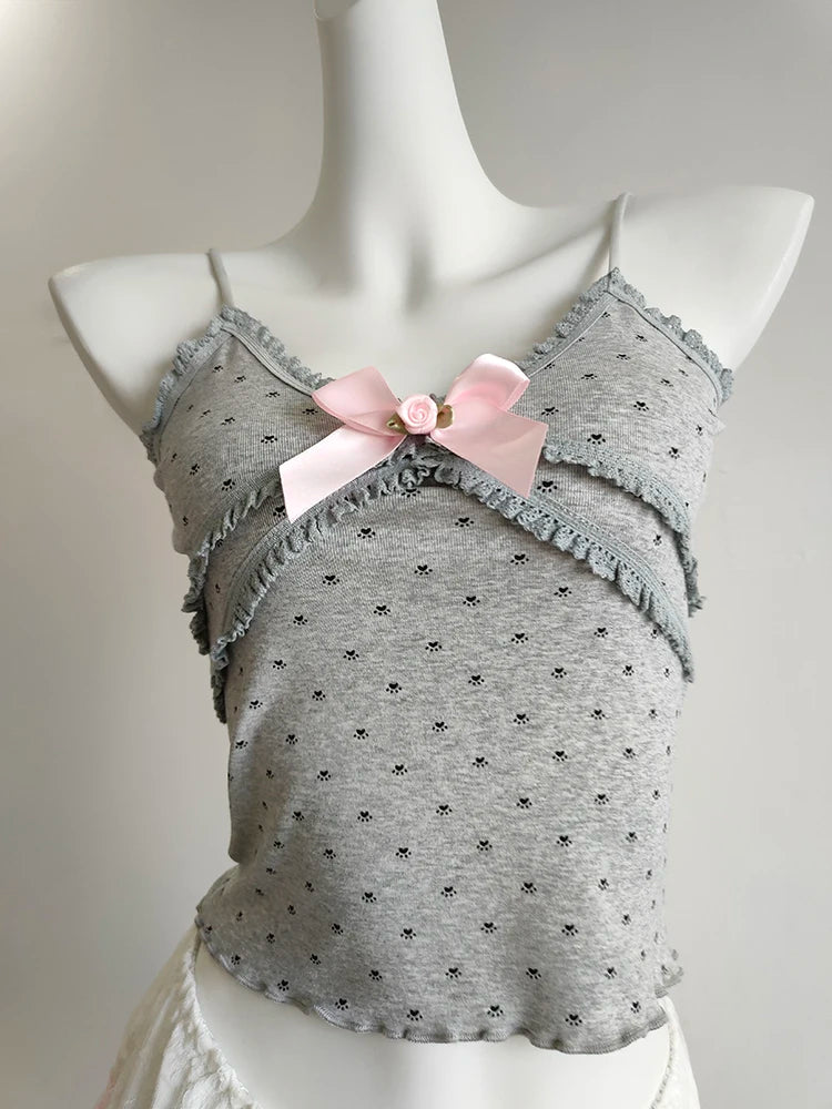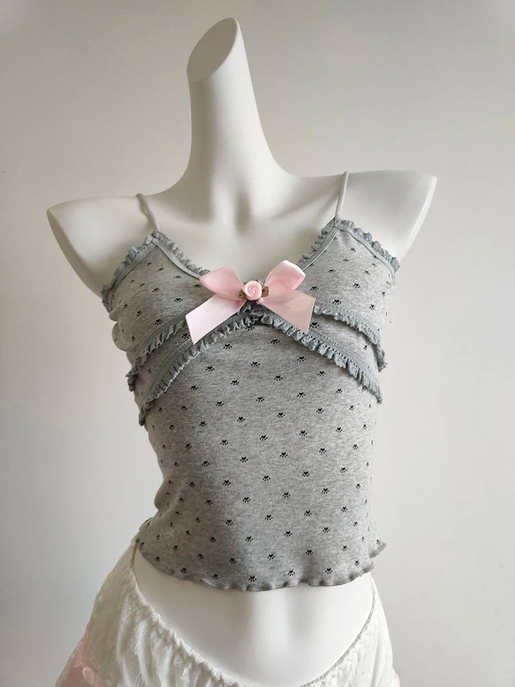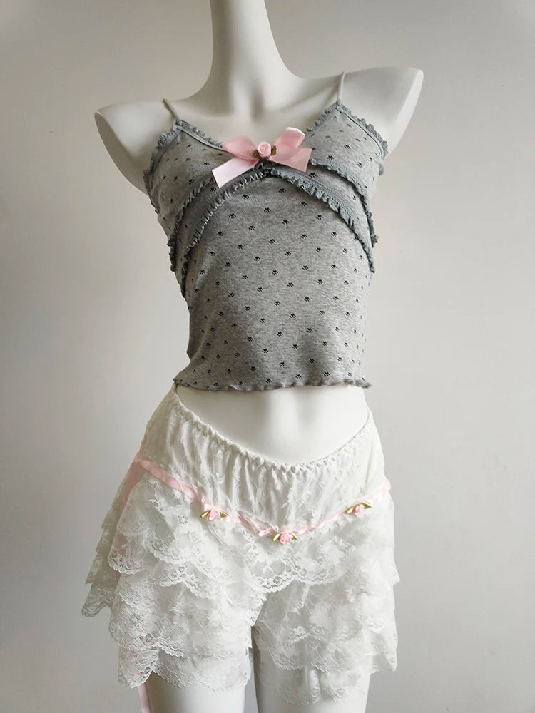 This sweet cami and shorts set is full of soft, summery charm. The cropped cami features a delicate paw pattern, lace trim, and tiny pink bows for a girly finish. Paired with flowy matching shorts and a comfy elastic waistband, it’s perfect for staying cute and comfy all day.
