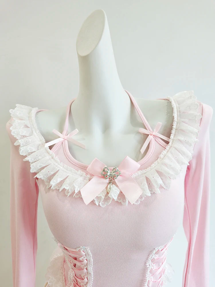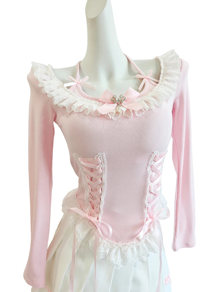 A cozy long-sleeve tee lined with soft fleece for extra warmth. Finished with lace trim and a delicate lace-up front, it keeps a sweet, doll-like look even on chilly days. Perfect for pairing with skirts or layered under jumpers in autumn and winter.