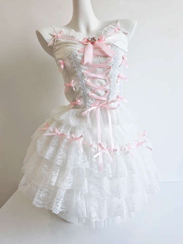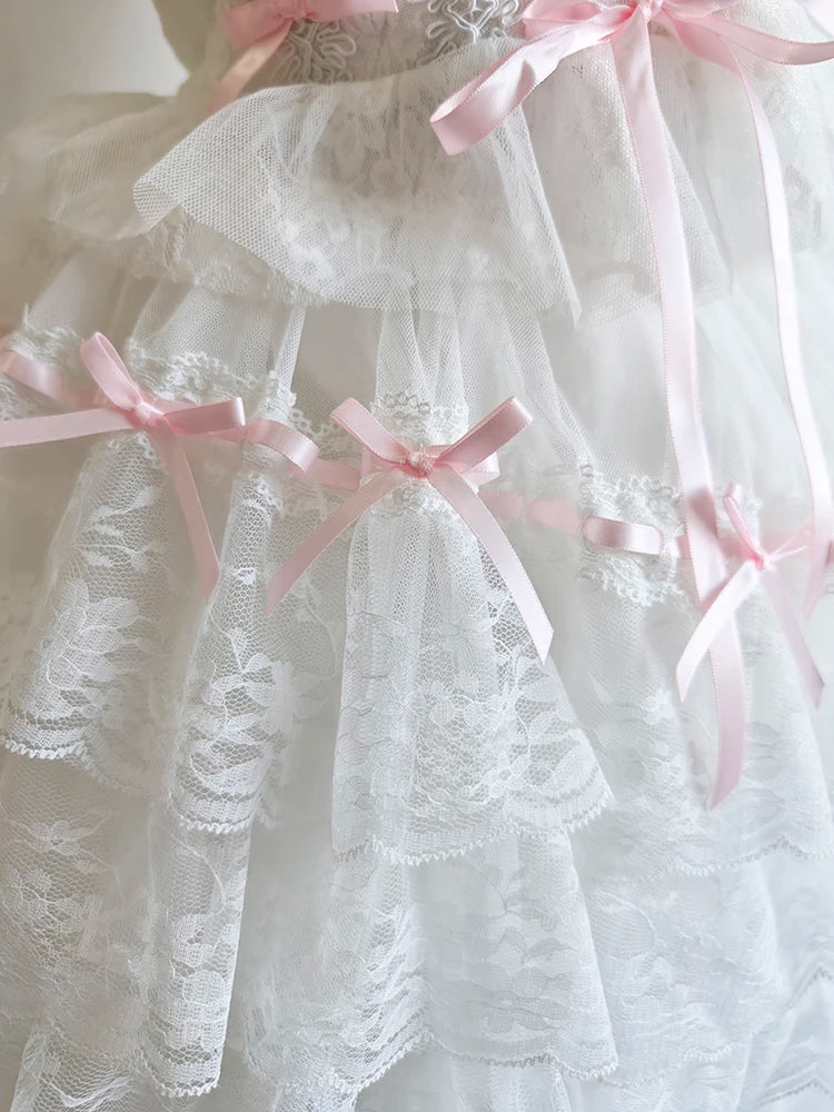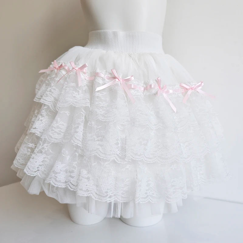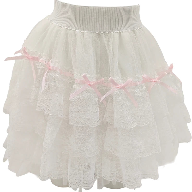 A fairytale-inspired skirt layered with lace and sweetness. This white A-line piece is adorned with soft pink bows and delicate ruffles, creating a dreamy silhouette that feels straight out of a doll’s closet.